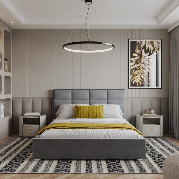und mit einem weichen, strapazierfähigen Stoff bezogen, der dem Schlafzimmer eine