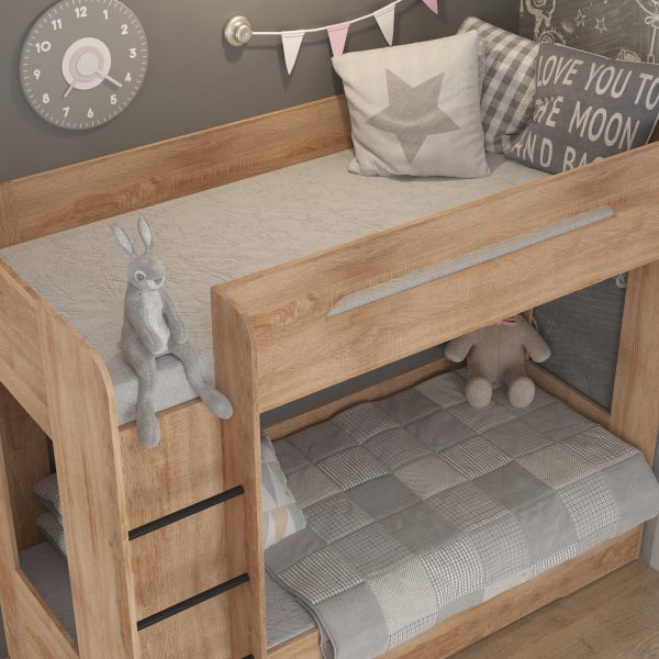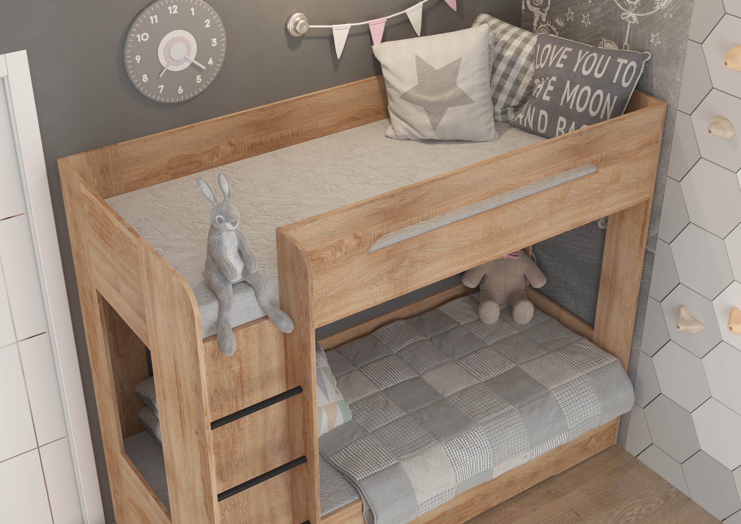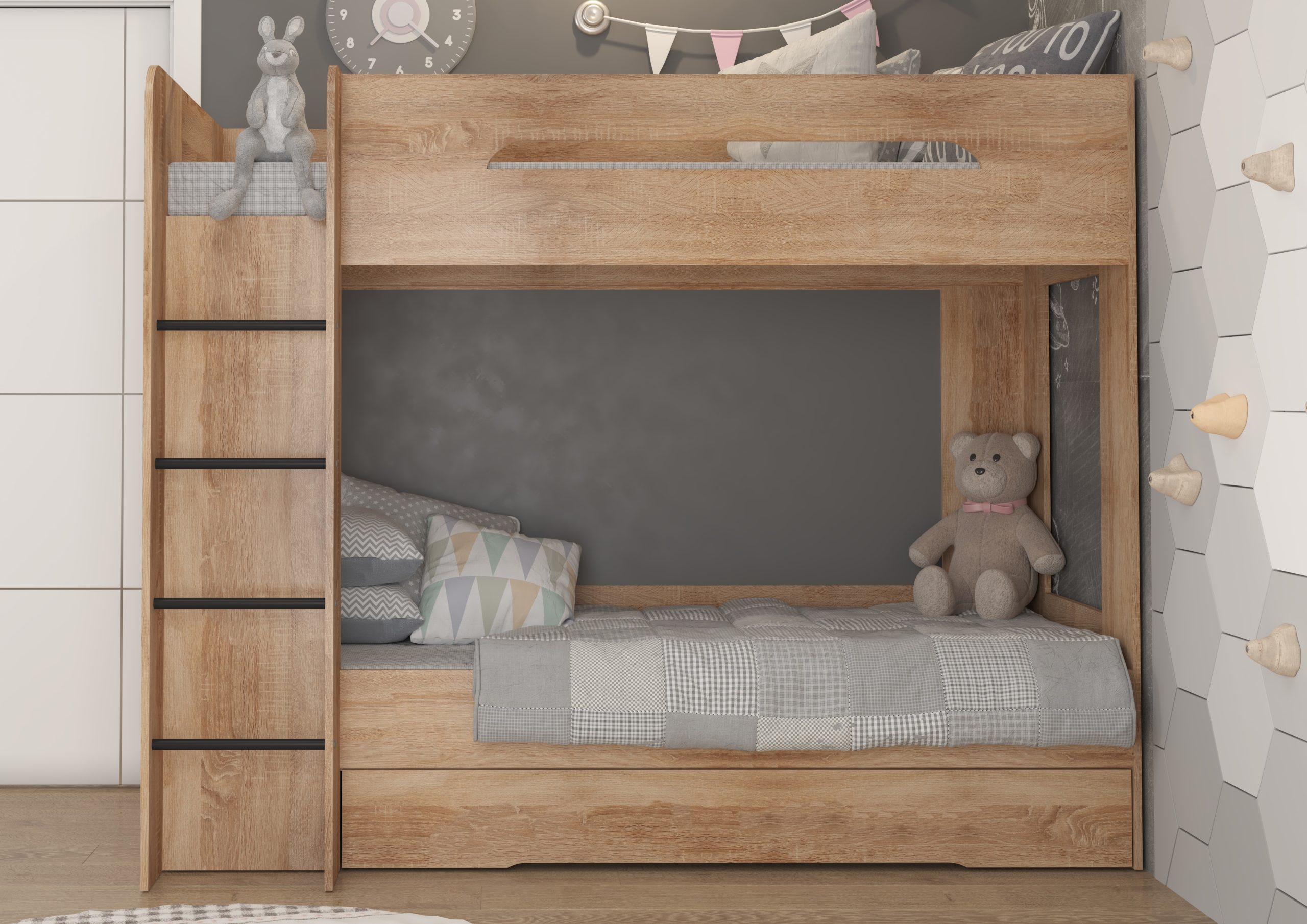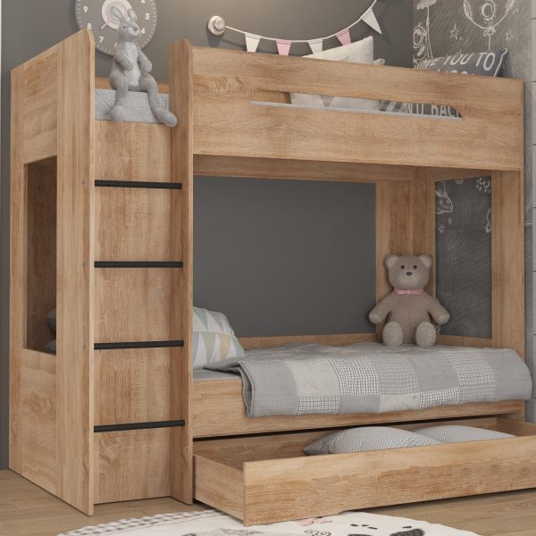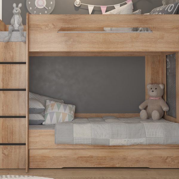 Etagenbett BLANC ist ein modernes, funktionales und platzsparendes Möbelstück, das perfekt für Kinder- oder Jugendzimmer geeignet ist. Es bietet zwei komfortable Schlafplätze sowie eine ausziehbare untere Schublade, die als praktischer Stauraum für Bettwäsche, Spielzeug oder Kleidung genutzt werden kann. Dank der stabilen Leiter und der hohen Absturzsicherung auf der oberen Etage garantiert dieses Bett Sicherheit und Komfort im Alltag.