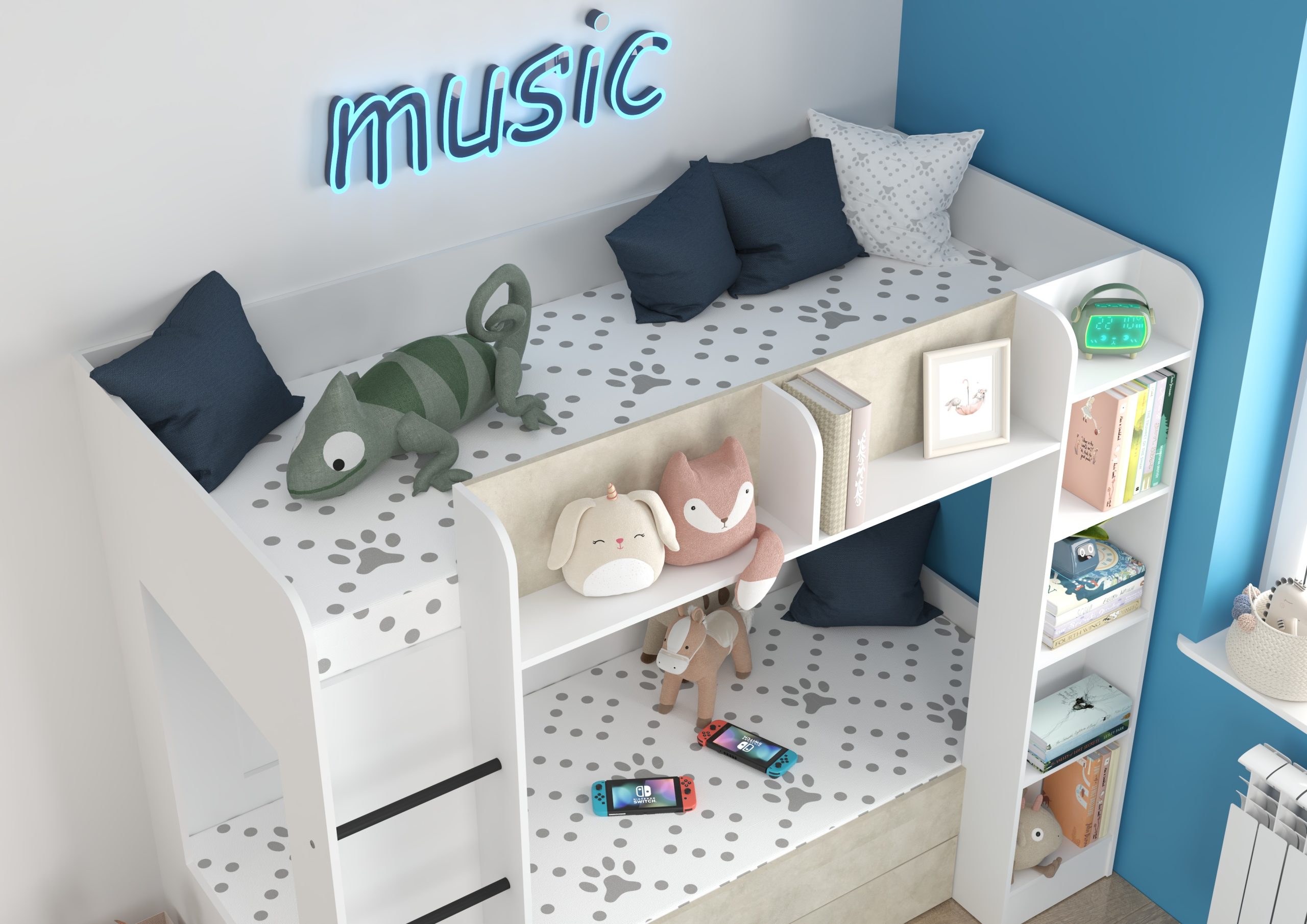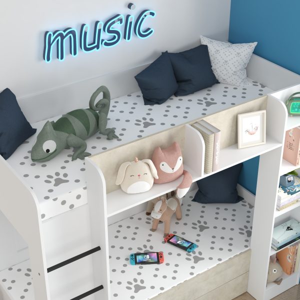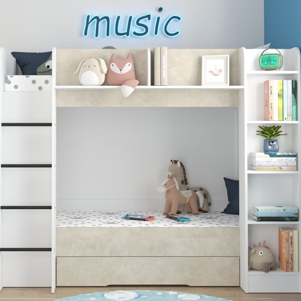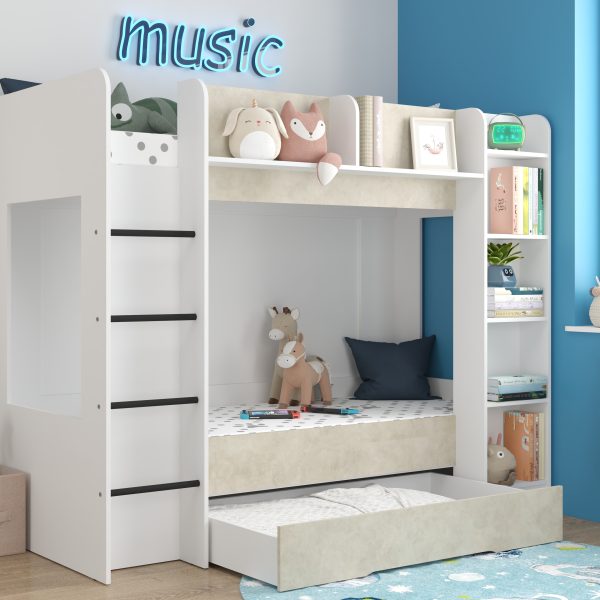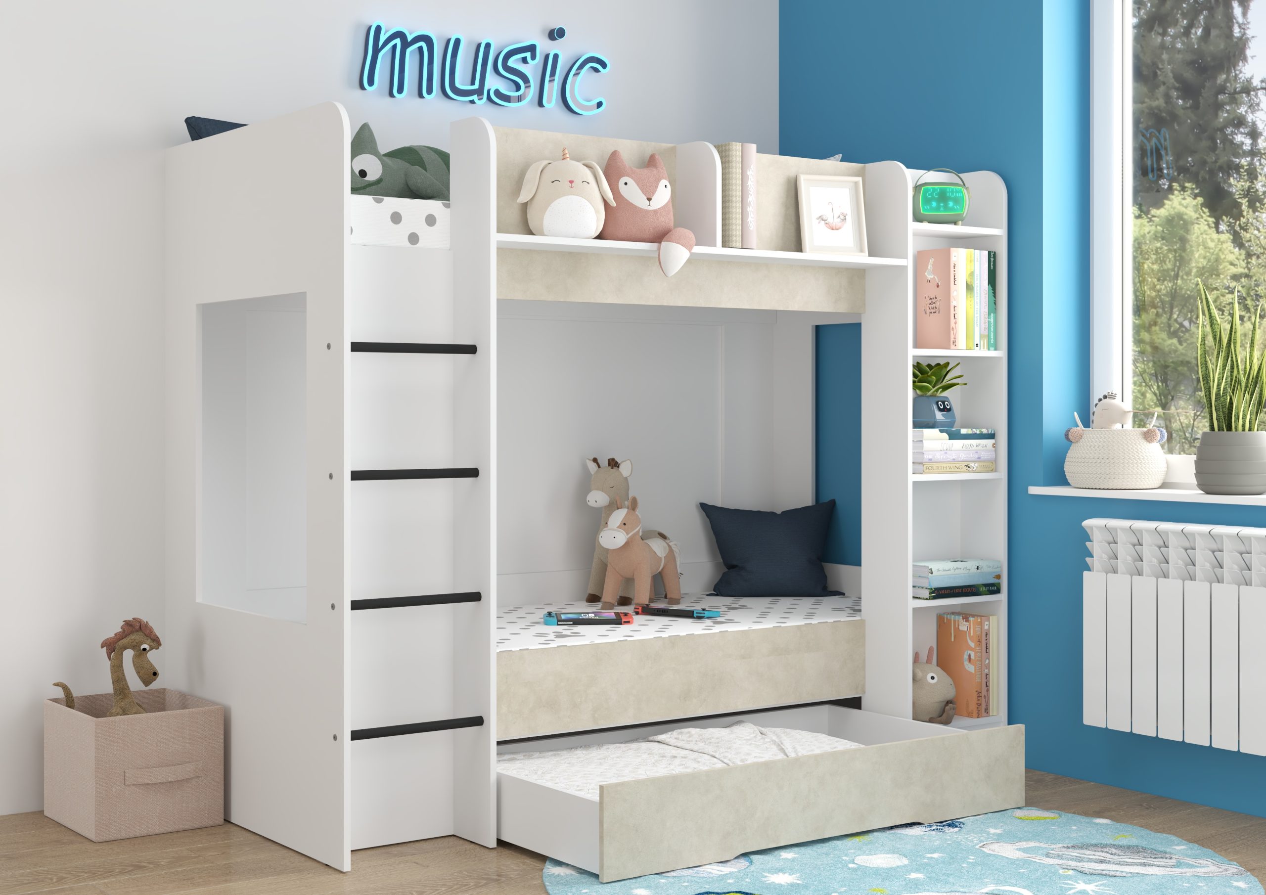 Das Etagenbett EVEREST ist eine 3-in-1 Lösung – zwei Schlafplätze, integriertes Regal und zusätzlicher Stauraum in einem kompakten, modernen Design. Ideal zur platzsparenden Einrichtung moderner Kinderzimmer.