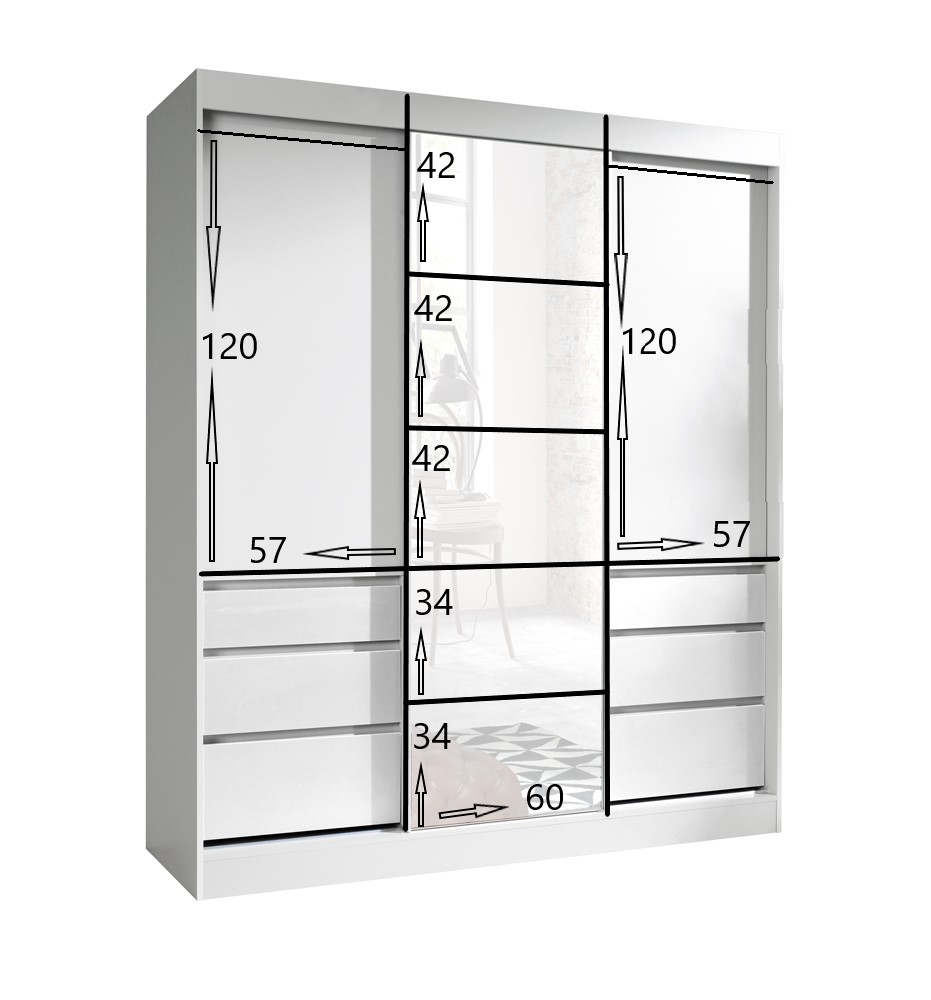 Der Schrank aus der Kollektion HAITI 180 ist ein kompaktes und praktisches Möbel, das sich perfekt in jede Farbgebung des Raumes einfügt. Der Schrank ist mit einer 3-türigen Spiegelfront ausgestattet, hinter der sich 5 Regale, 3 Schubladen auf jeder Seite des Schrankes und 2 Kleiderstangen befinden.