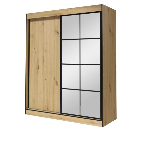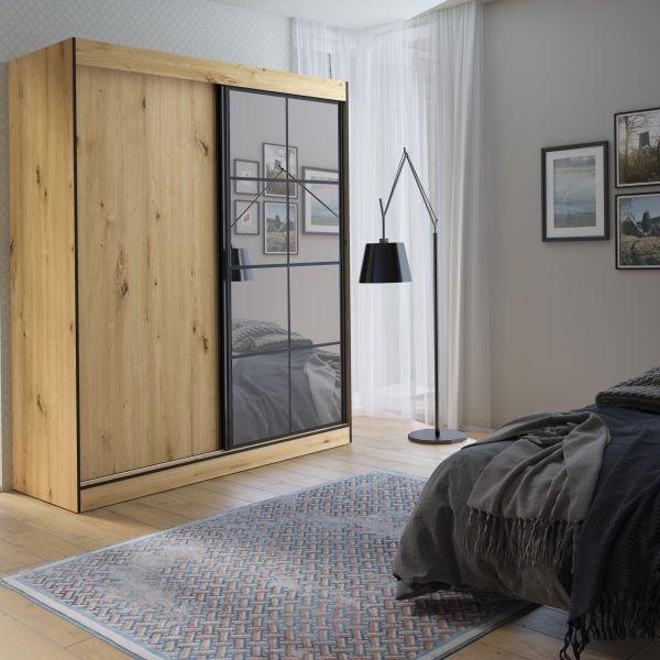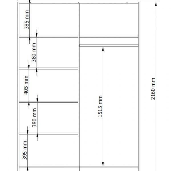 Der Schrank aus der Kollektion OSLO II ist ein praktisches und funktionales Möbel, das sich perfekt in jede Farbgebung des Raumes einfügt. Der Schrank ist mit einer 2-türigen Schiebefront ausgestattet, hinter der sich 5 Regale und eine Kleiderstange befinden.
