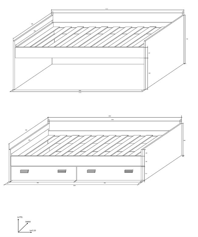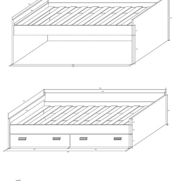• Zwei Schubladen für Bettwäsche und Holzlattengestell