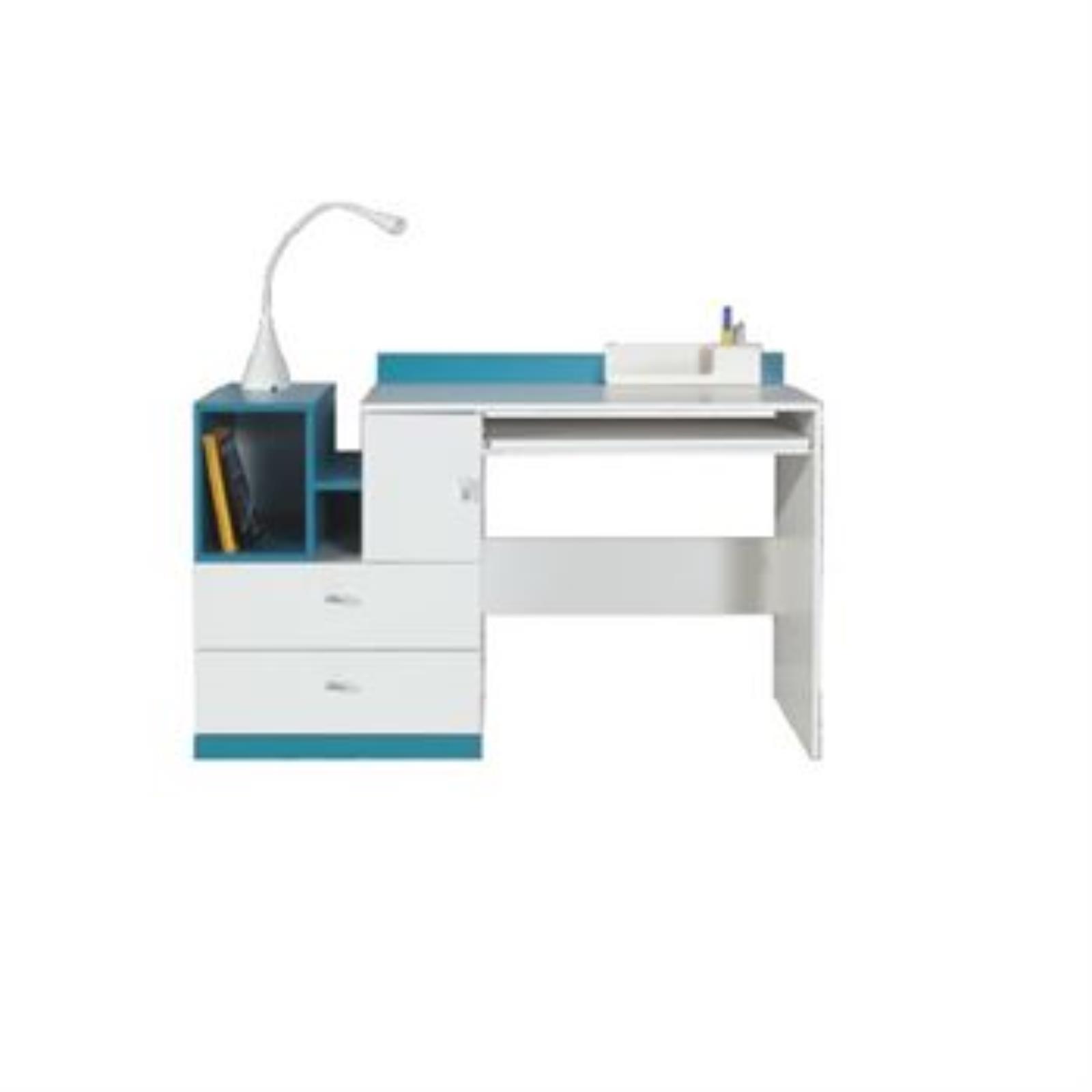 Der Schreibtisch MO11 ist mit zwei Schubladen und einem Schrank ausgestattet, wie auf dem Foto gezeigt. Es zeichnet sich durch Funktionalität, Kompaktheit und futuristisches Design aus.