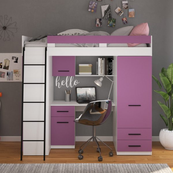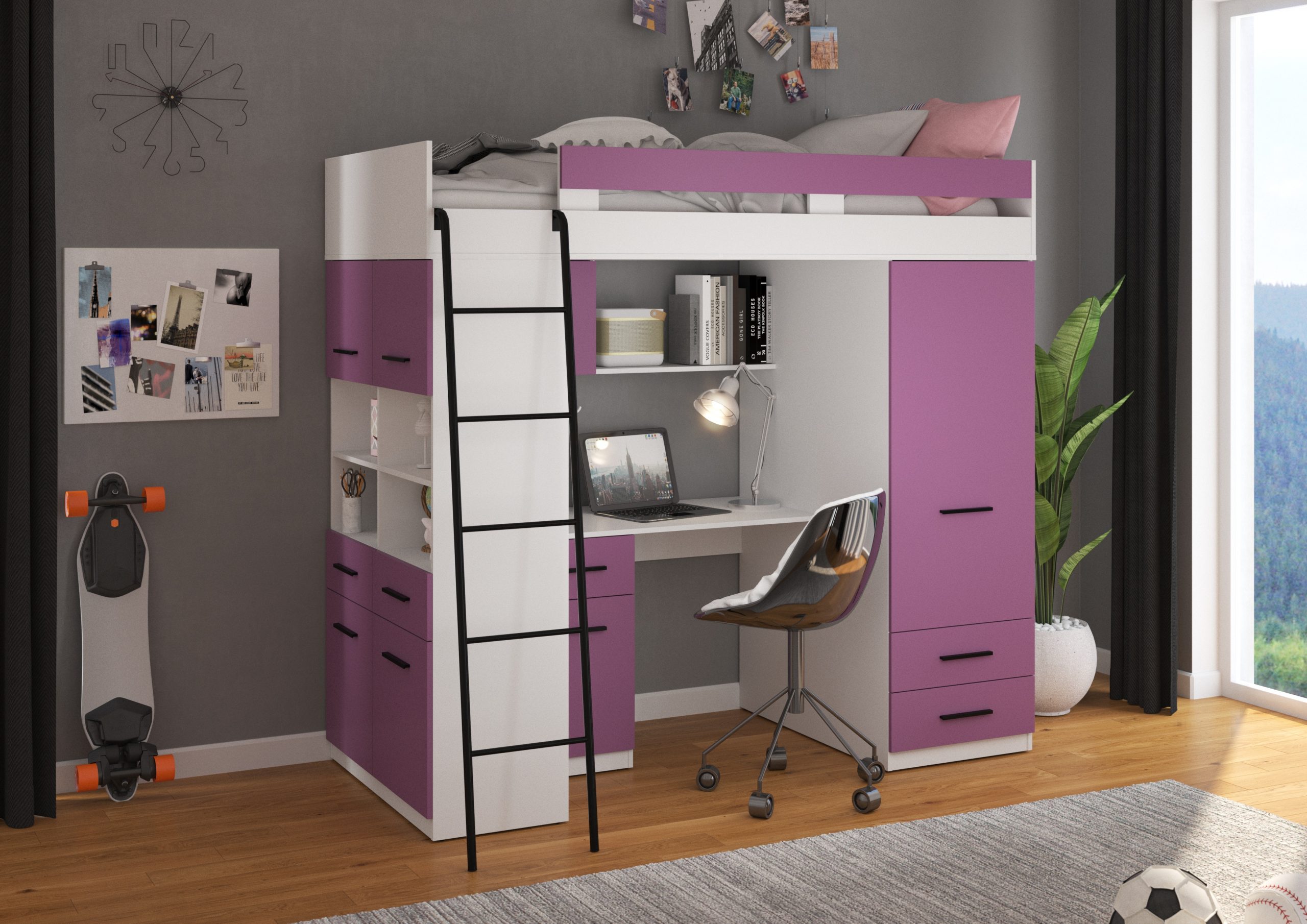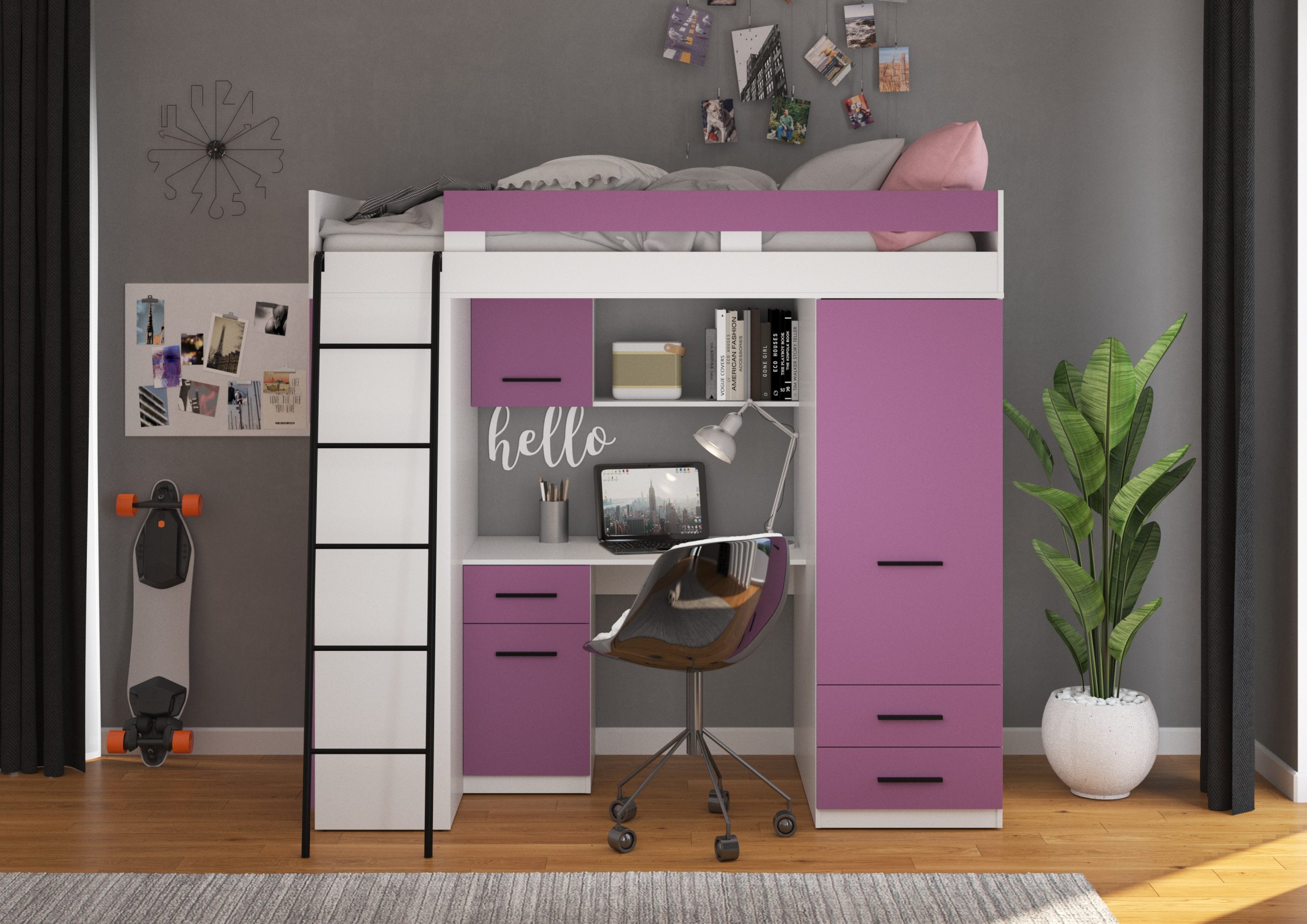 Etagenbett LEVEL ist ein kompaktes, praktisches und funktionales Möbel, das im Kinder- oder Jugendzimmer Verwendung findet. Ermöglicht eine ergonomische Nutzung des vorhandenen Platzes. Dieses Etagenbett verfügt über eine bequeme und sichere Leiter, die zusätzlich mit einem Schreibtisch, einem geräumigen Kleiderschrank und Regalen ausgestattet ist. So ermöglicht sie neben der Schlaffunktion eine einfache Organisation und Aufbewahrung.