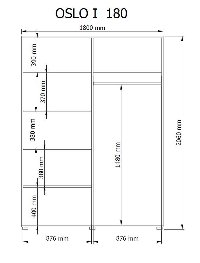L’armoire 180 de la collection OSLO I est un meuble pratique et fonctionnel qui s’intégrera parfaitement dans n’importe quelle palette de couleurs de la pièce. L’armoire est équipée d’une façade à ouverture classique à 4 portes, derrière laquelle se trouvent 5 étagères et une barre pour cintres.