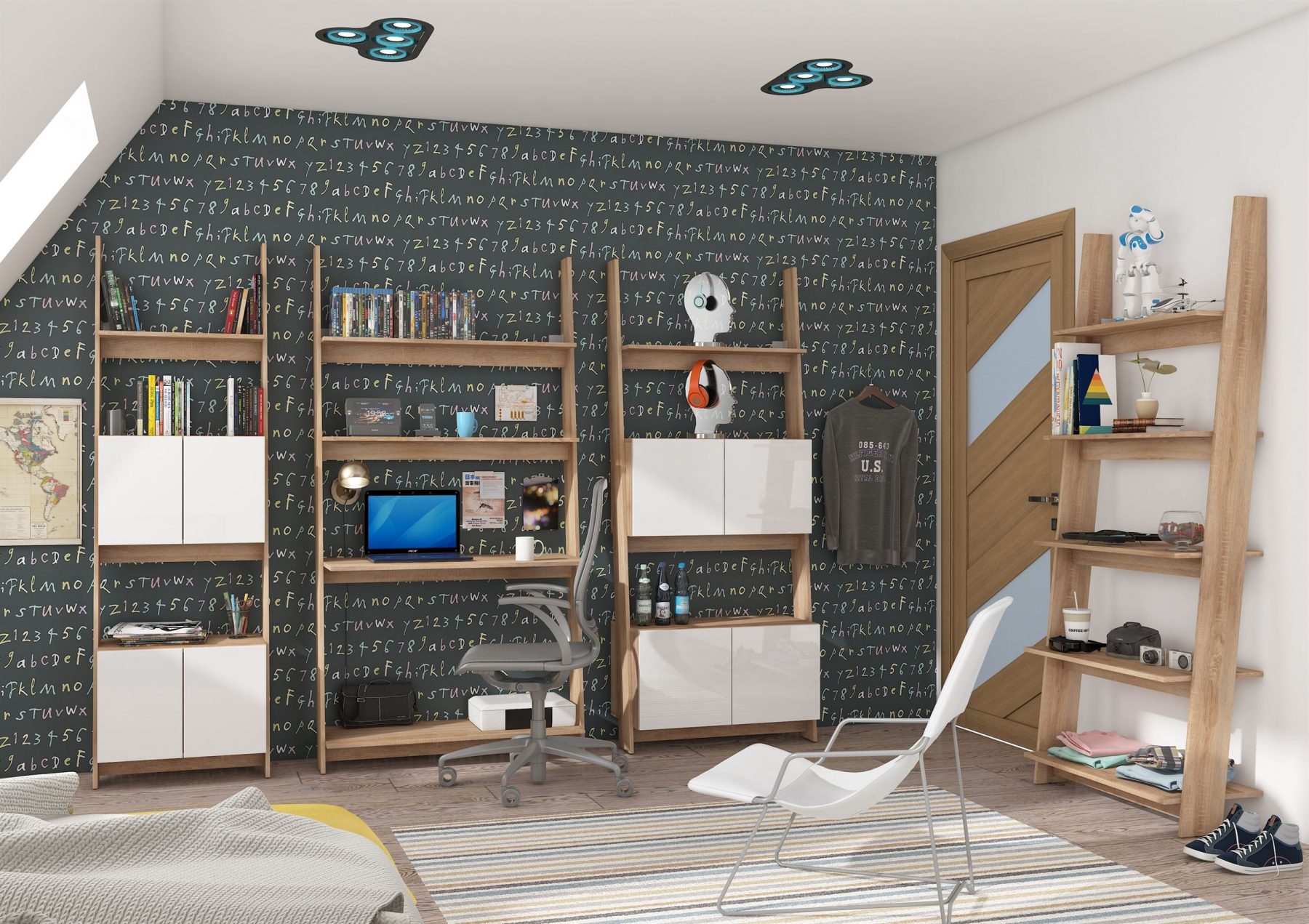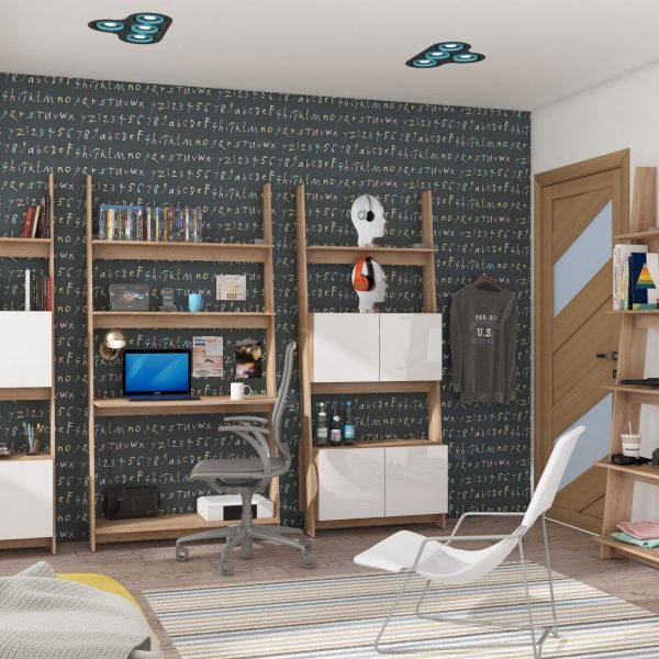 L’ensemble peut être élargi avec des modules supplémentaires de la collection RACK et c’est un complément parfait à la collection TEDDY et / ou lits mezzanine de la même couleur ainsi que des armoires.