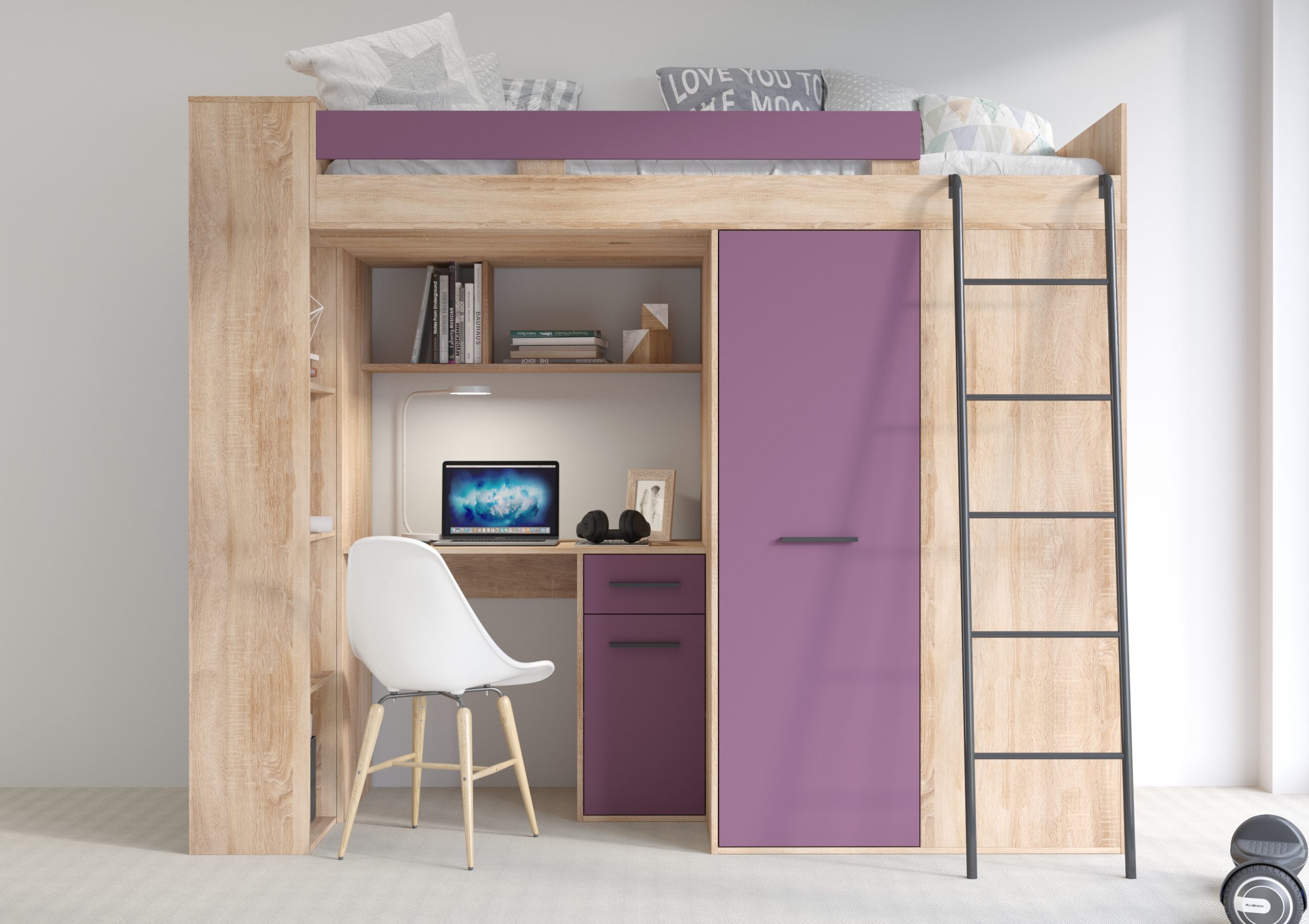 Lit mezzanine VERANA c’est un meuble compact, pratique et fonctionnel, qui peut être utilisé dans une chambre d’enfant ou d’ado. Il permet d’utiliser l’espace disponible de manière ergonomique. C’est un lit superposé avec une échelle confortable et sécurisée, qui était équipé en plus d’un bureau, d’une armoire spacieuse et d’étagères. Grâce à ça, en dehors de l’endroit pour dormir, il permet l’organisation et le stockage simple.