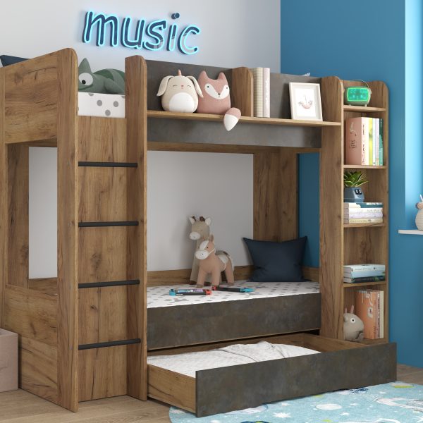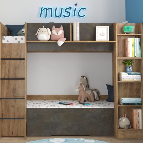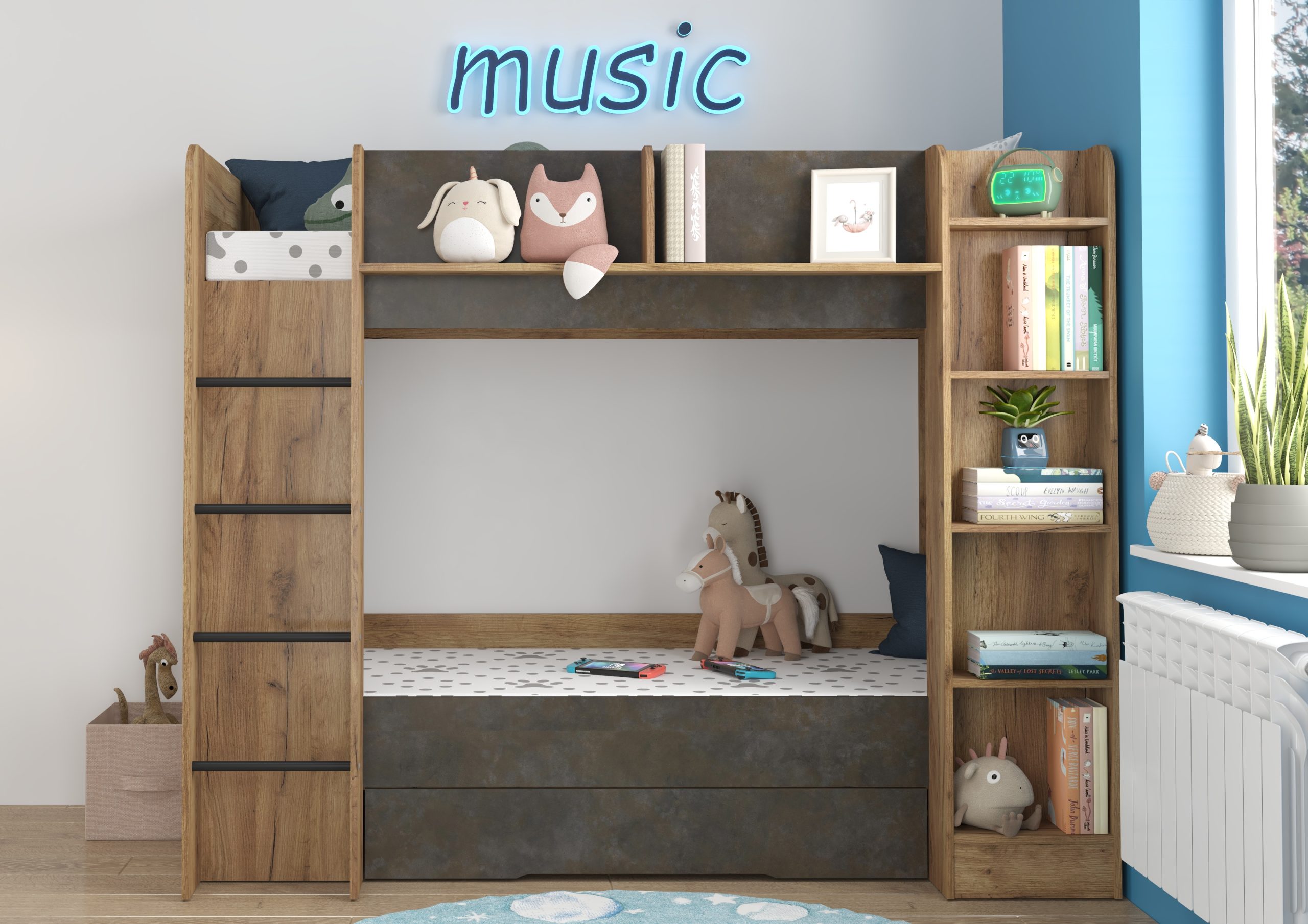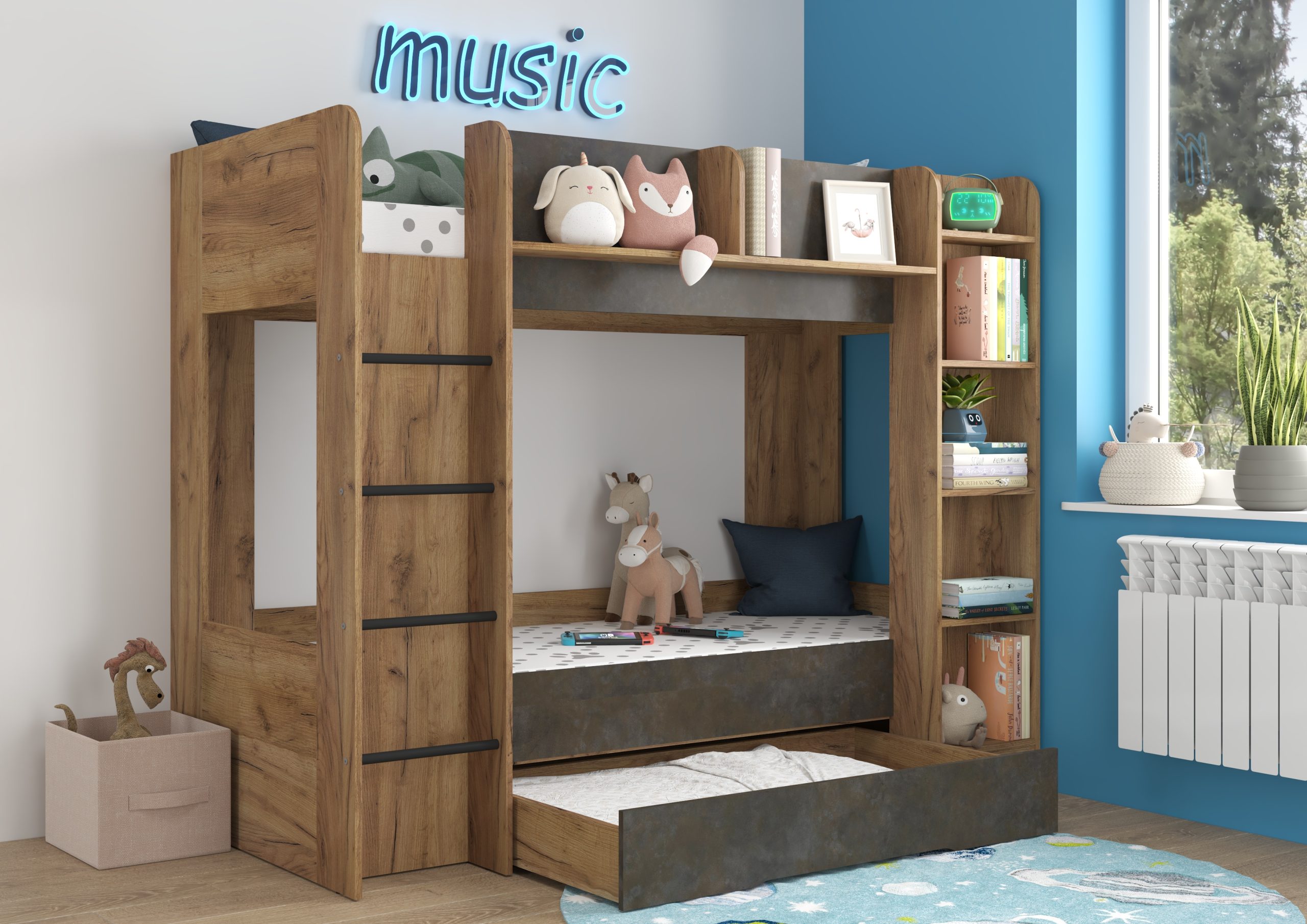 The EVEREST bunk bed is a modern, functional, space-saving piece of furniture that’s perfect for children’s and teens’ rooms. It provides two comfortable sleeping levels, an integrated bookshelf, and a pull-out lower drawer that serves as convenient storage for bedding, toys, or clothing. With a sturdy ladder and a safety guard rail on the upper bunk, it ensures everyday comfort and safety.