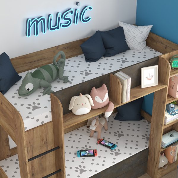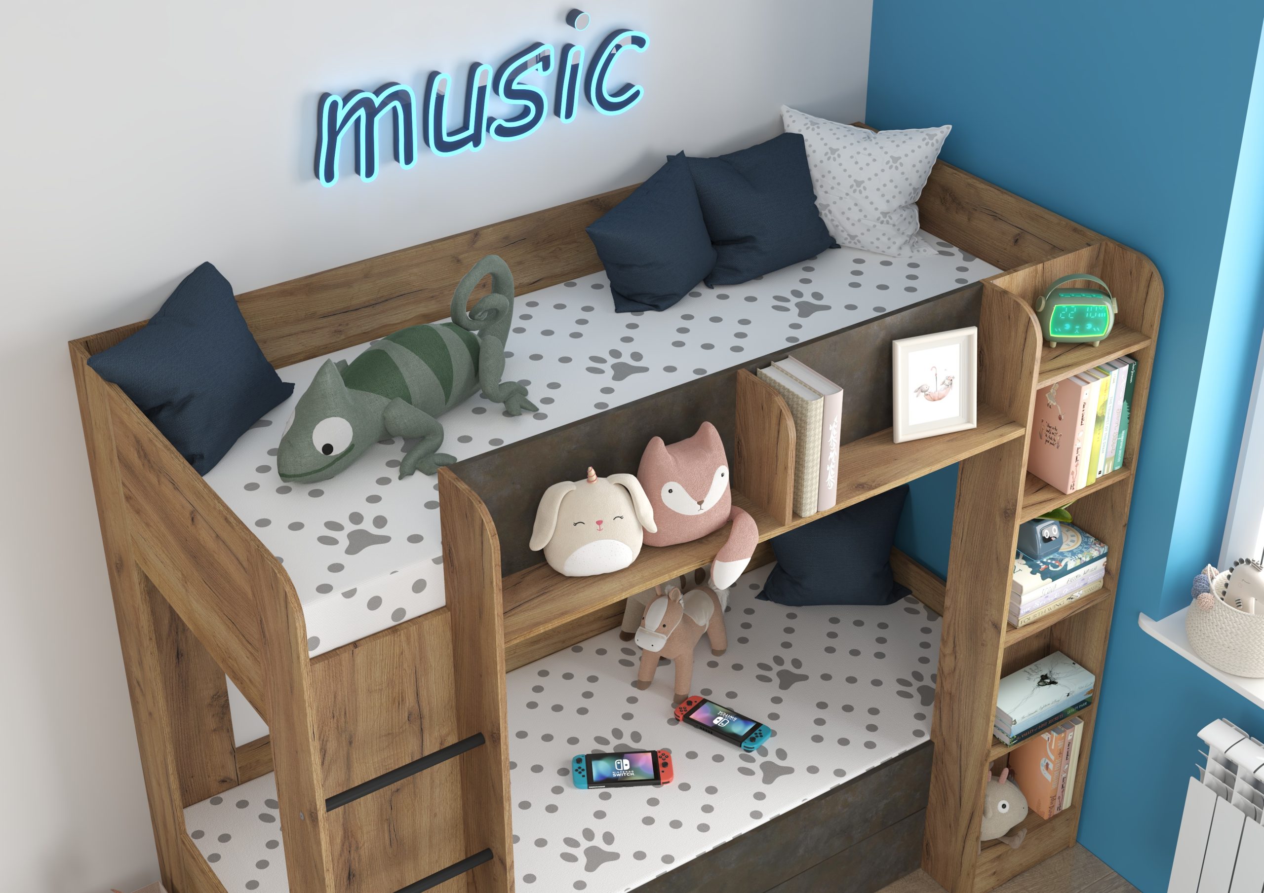 The EVEREST bunk bed is a 3-in-1 solution – two sleeping spaces, an integrated bookshelf and extra storage, all in a compact, modern design. Ideal for space-saving kids’ rooms.