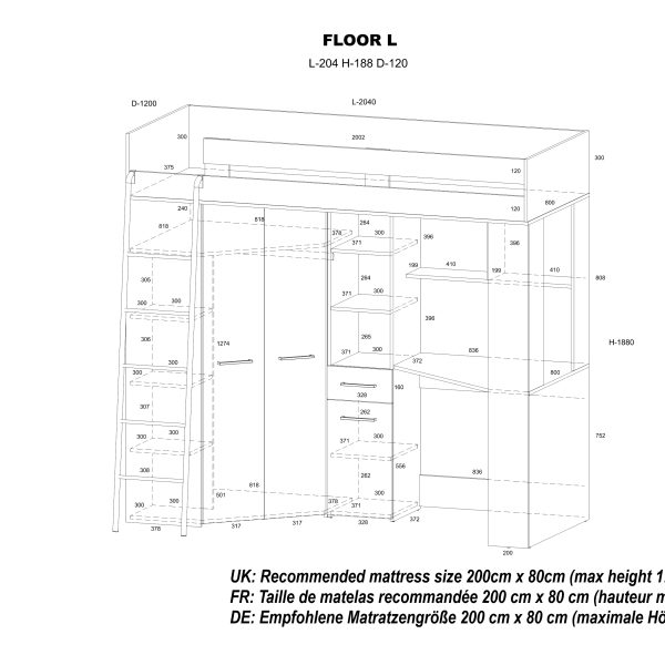 The multifunctional FLOOR loft bed is a smart and space-saving solution designed for children’s and teenager’s bedrooms. With its 3-in-1 functionality, it combines a comfortable bed, a practical study area and a spacious wardrobe into one clever piece of furniture. Ideal for compact rooms where every centimetre counts!