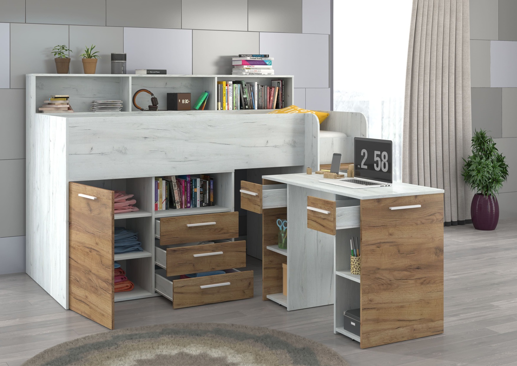 A Mezzanine bed from the NEO L or R series is a piece of furniture that will allow you to arrange a child’s room in a practical way. It is very compact, functional and roomy. It is equipped with a bunk bed accessed by a safe staircase. In addition, the mezzanine provides a lot of storage space, thanks to numerous shelves, cabinets and drawers, and the pull-out desk allows for comfortable learning and saves space to play in our child’s room.