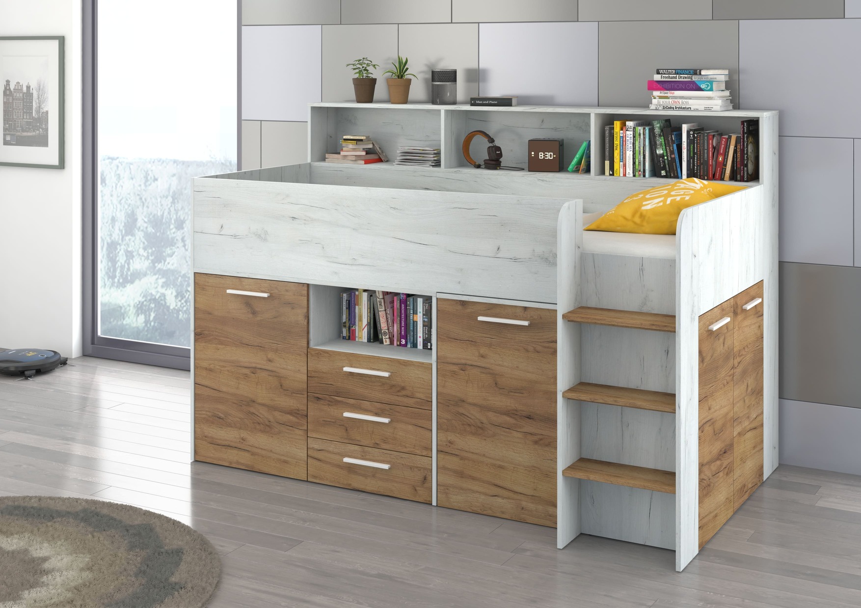 - A mezzanine bed with steps
