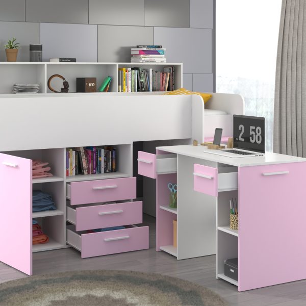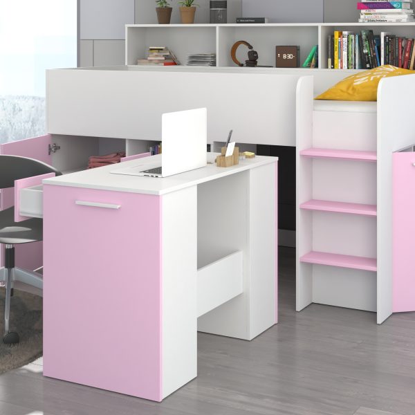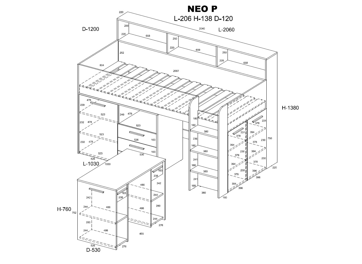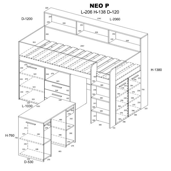 A Mezzanine bed from the NEO L or R series is a piece of furniture that will allow you to arrange a child’s room in a practical way. It is very compact, functional and roomy. It is equipped with a bunk bed accessed by a safe staircase. In addition, the mezzanine provides a lot of storage space, thanks to numerous shelves, cabinets and drawers, and the pull-out desk allows for comfortable learning and saves space to play in our child’s room. Description: