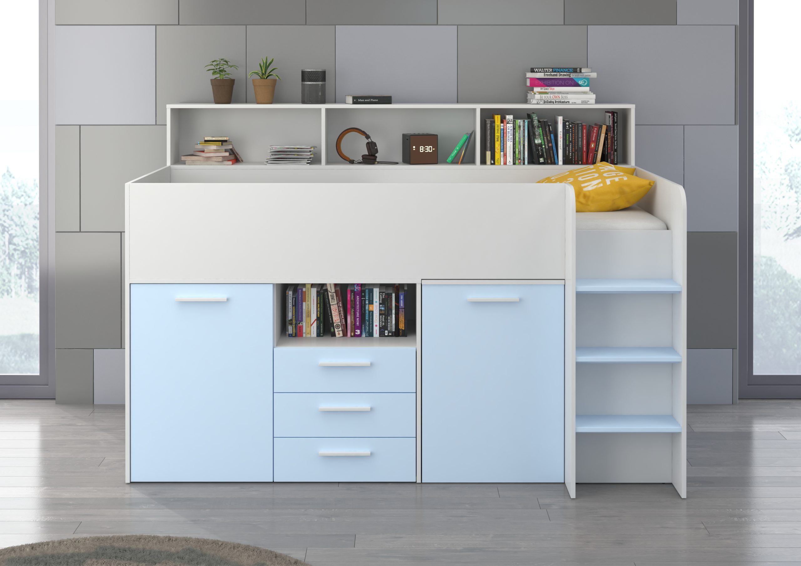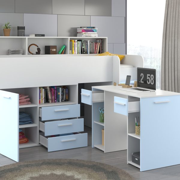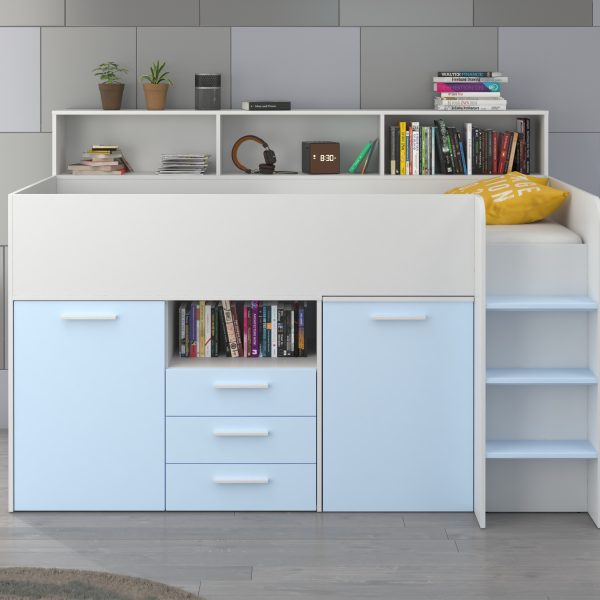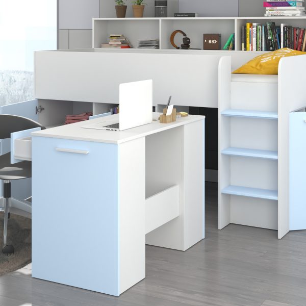 Mezzanine bed NEO White / Sky-blue – Right side steps