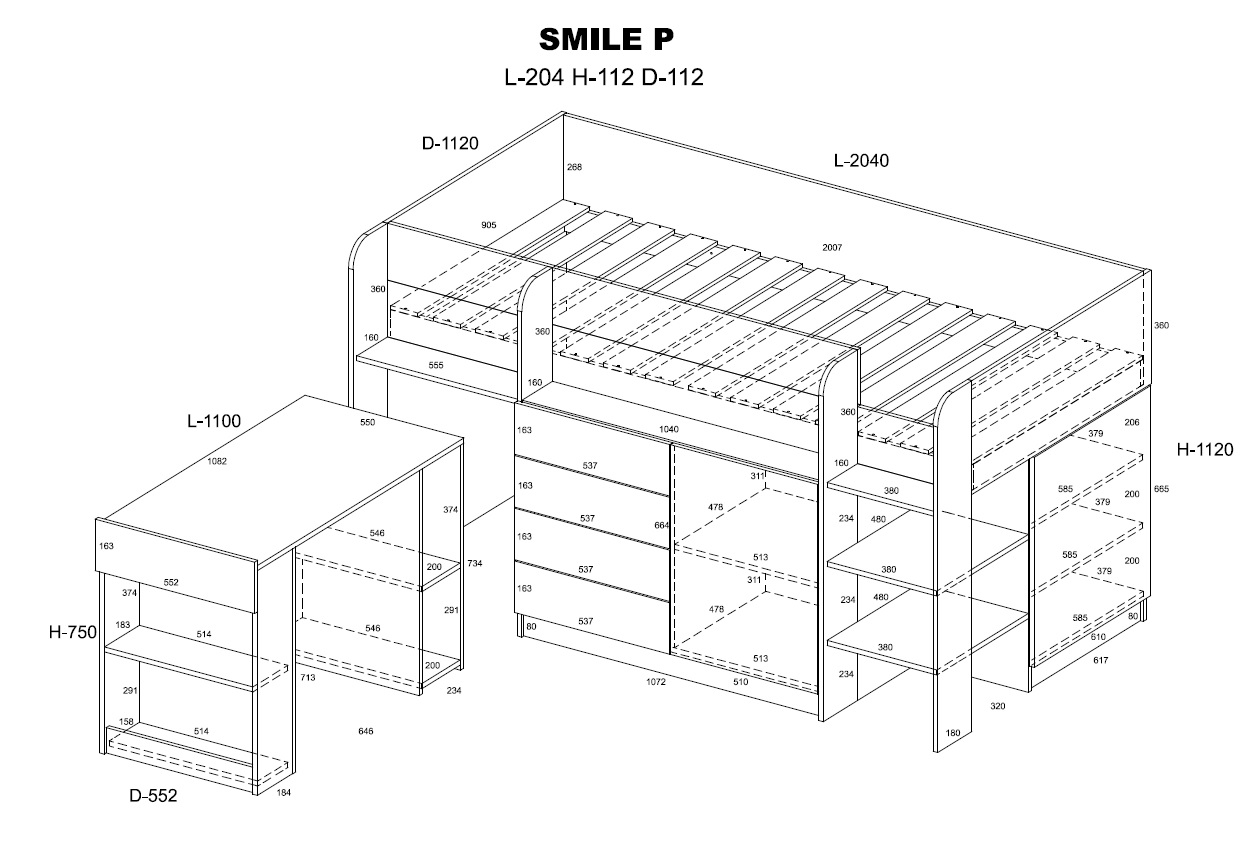 A Mezzanine bed from the SMILE L or R series is a piece of furniture that will allow you to arrange a child’s room in a practical way. It is very compact, functional and roomy. It is equipped with a mezzanine bed accessed by a safe staircase. In addition, the mezzanine provides a lot of storage space, thanks to numerous shelves, cabinets and drawers, and the pull-out desk allows for comfortable learning and saves space to play in our child’s room.