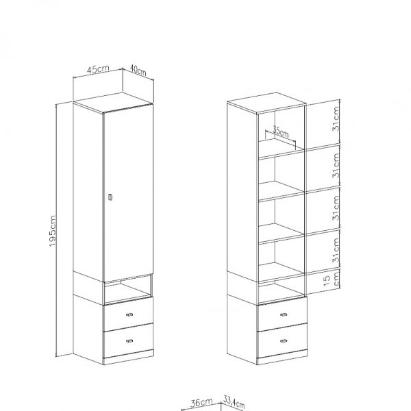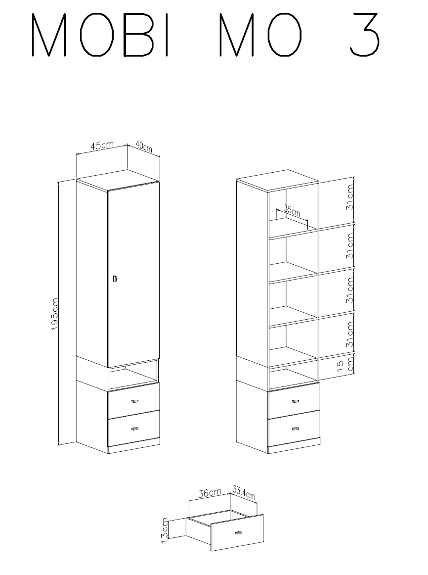 The High Bookcase MO03 is equipped with two drawers and a cabinet as shown in the photo. It is characterized by functionality, compactness and space saving in the children’s room. A perfect complement to elements of the collection: MO19, MO20 or MO21.