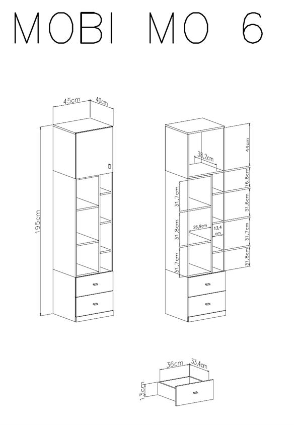 The High Bookcase MO06 is equipped with two drawers and a cabinet at the top of the furniture as shown in the photo. It is characterized by functionality, compactness and space saving in the children’s room. A perfect complement to elements of the collection: MO19, MO20 or MO21.