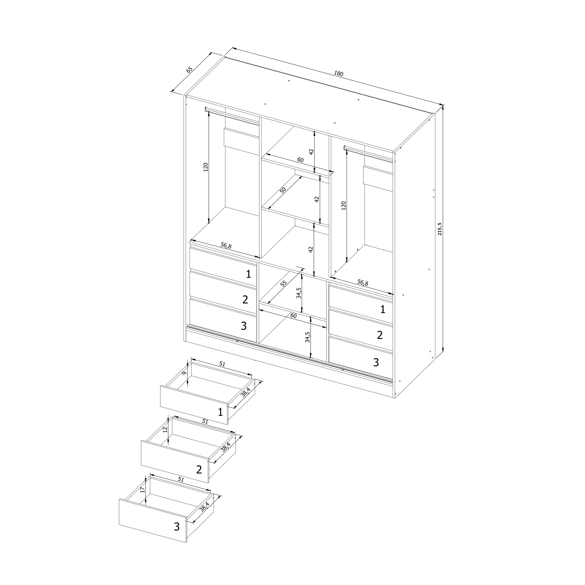 The wardrobe from the HAITI 180 collections is a compact and practical piece of furniture that will fit perfectly into any color scheme of the room. The wardrobe is equipped with a 3 sliding-door. Sliding mirrored front and behind it there are 5 shelves, 3 drawers on each side of the wardrobe and 2 bars for hangers.